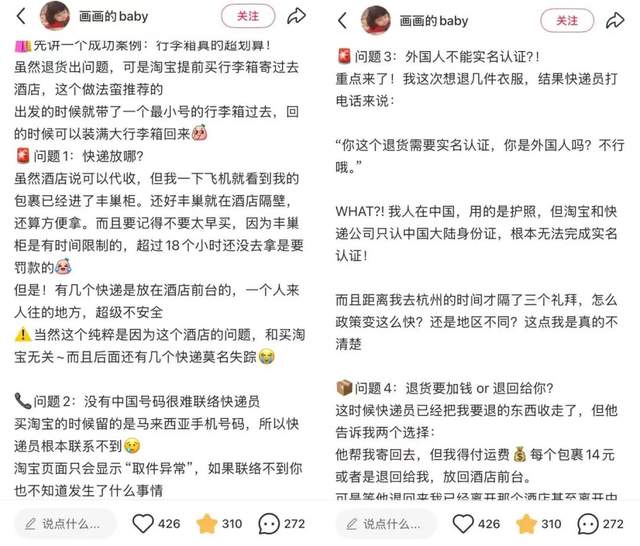 今年 5 月去成都旅行时,为了装淘宝买到的 20 多件商品,她特意网购了行李箱。但在退不合适的衣服时遇到了问题卓信宝,由于快递需要实名认证,只有护照的外国游客很难操作,最后只好请快递员帮忙退货,但每个包裹需要多付 14 元的运费。