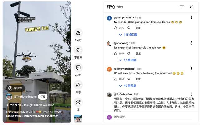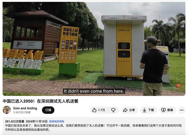 这种体验比起打卡景点,能够带来更多的社交货币价值。在 TikTok、YouTube 和 Instagram 上,那些晒出在中国酒店使用机器人送外卖、体验无人机外卖的内容,远比一张传统的地标照片更吸引眼球,更具有分享和讨论价值。