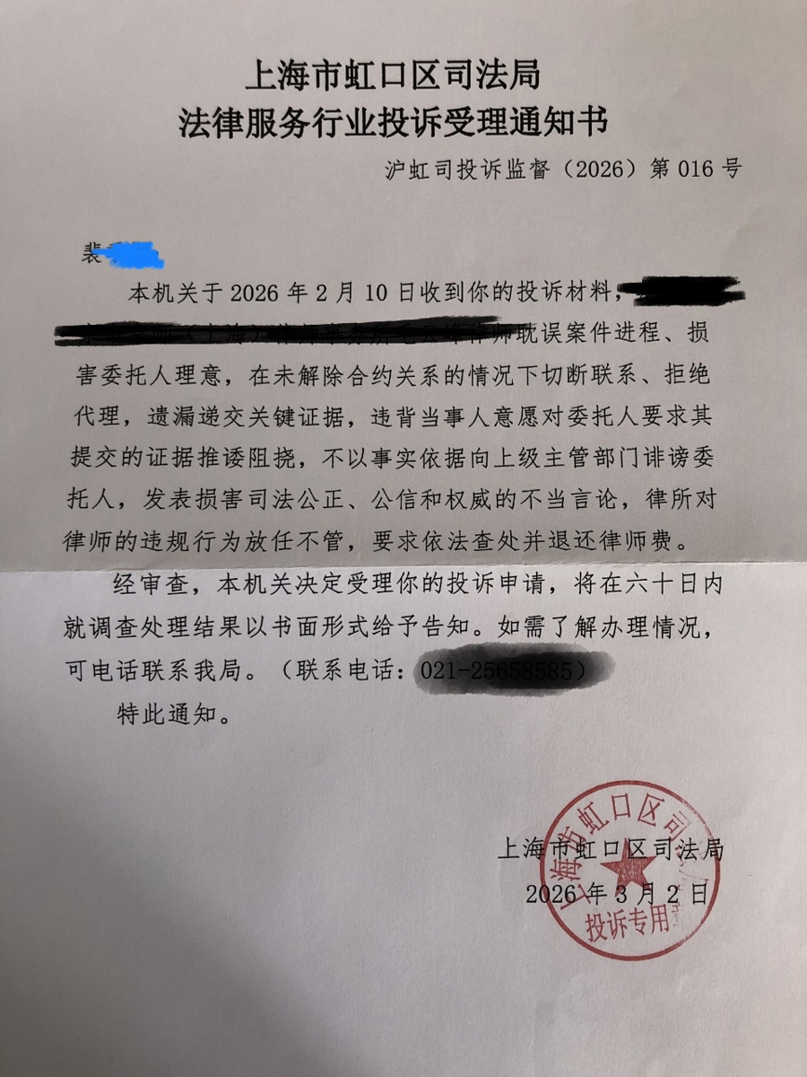 截至新民晚报截稿,裴女士反馈最新进展:针对涉事律师隐瞒鉴定受理信息、延误案件进程、无故缺席听证会、拉黑委托人失联等多项她投诉的内容,虹口区司法局已于2026年3月正式受理,将依法依规开展全面核查并作出处置。