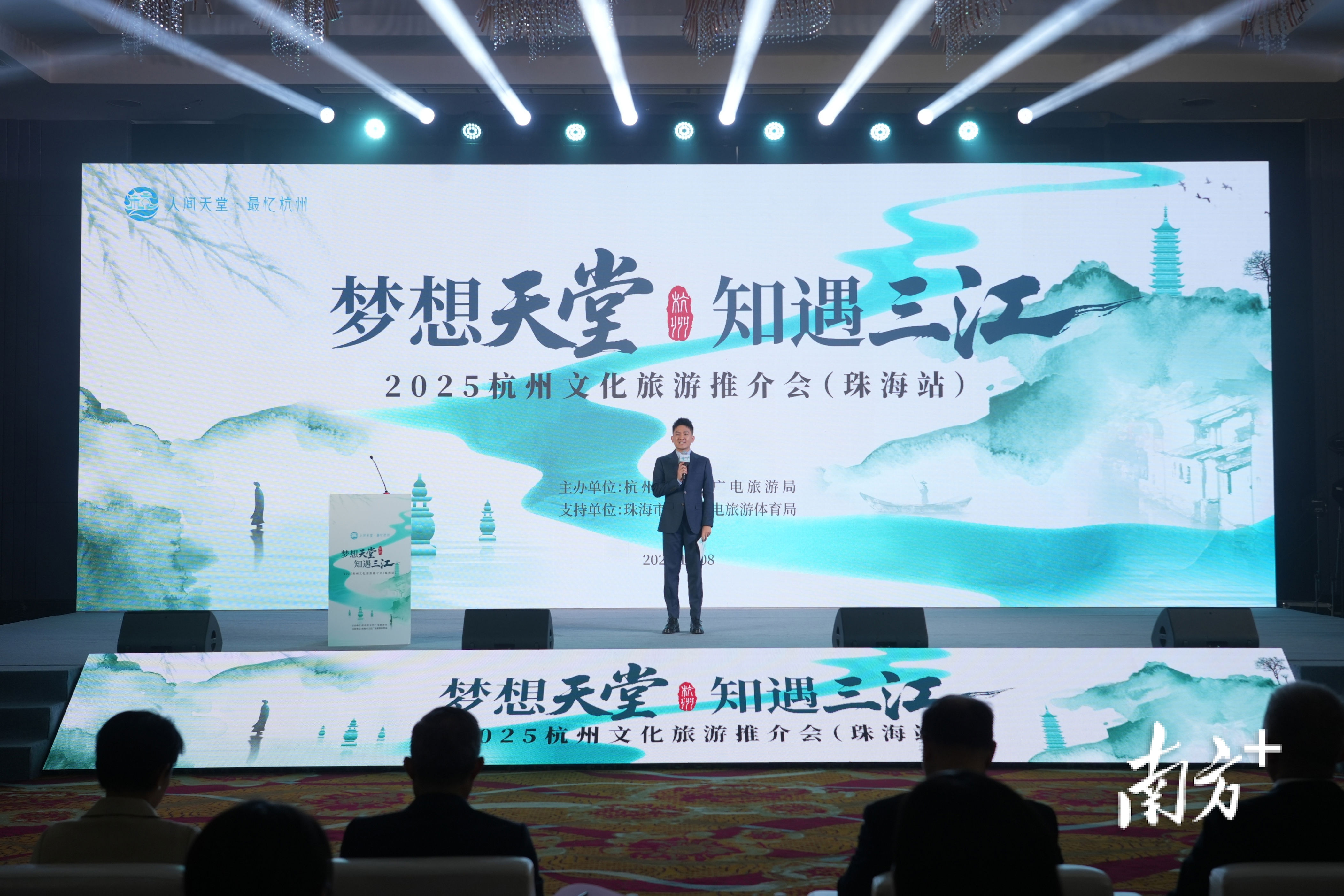 杭州市文化广电旅游局党组成员、二级巡视员刘宇峰在致辞中提到,珠海与杭州,虽隔山海却心意相通。杭州三江两岸的自然禀赋与民俗非遗,藏着杭州“破界共生”的文旅活力。“诚邀珠海朋友来到杭州,体验‘富春山居研学线’‘千岛湖康养线’‘新安江探秘线’等特色线路,更期待两地共享客源市场、共办文旅活动,让‘浪漫之城’与‘梦想天堂’的品牌相得益彰。”刘宇峰说。
