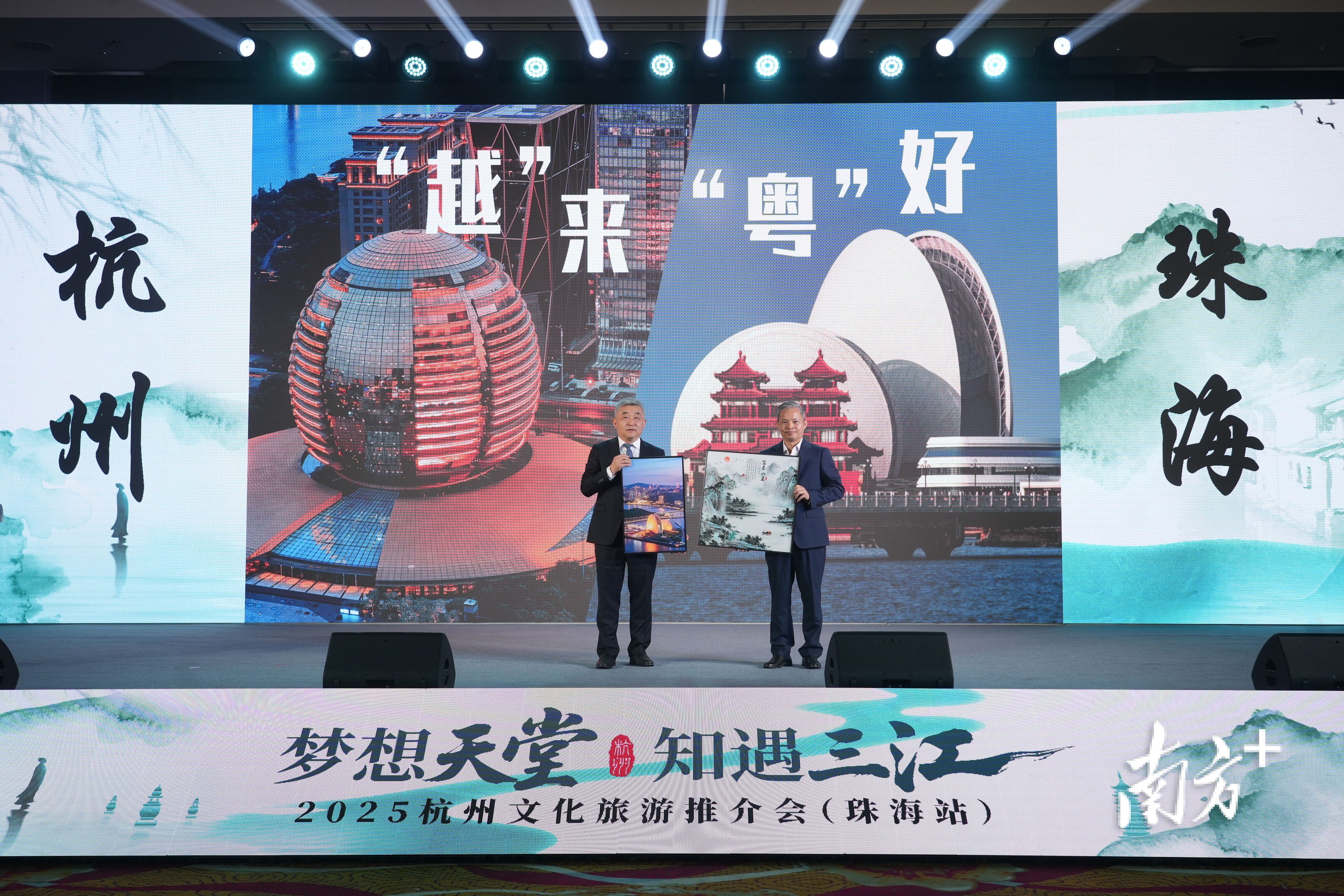 推介会现场还上演了温情一幕,杭珠两地相关领导登台参与“浙厢有礼—双城礼赠”环节。珠海城市名片“日月贝”壁画与杭州文化图腾“三江两岸版《富春山居图》”壁画完成交换,“珠生于贝”的湾区活力与“富春山水”的江南诗意在此完美交融,为这场双城知音之约写下生动注脚。
